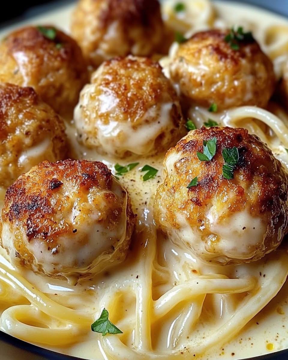 Este platillo es una combinación deliciosa de bolitas de pollo jugosas con un toque de ajo, acompañadas de una pasta cremosa y llena de sabor con parmesano. ¡Ideal para una comida reconfortante! 😋