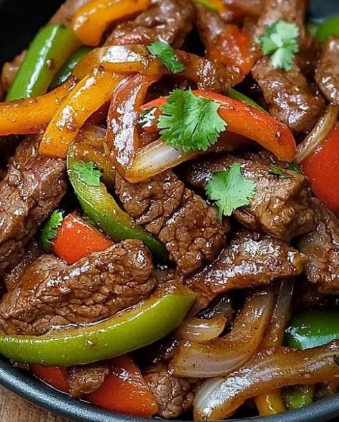Corta la carne en tiras finas y sazónala con sal y pimienta. Corta los pimientos y la cebolla, y pica el ajo.