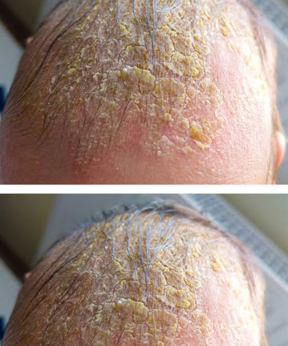 Una costra amarilla y supurante en el cuero cabelludo suele indicar irritación o infección. El líquido que supura de la piel se seca y endurece formando una costra, y el tono amarillo suele indicar pus, lo que indica una infección o inflamación subyacente.