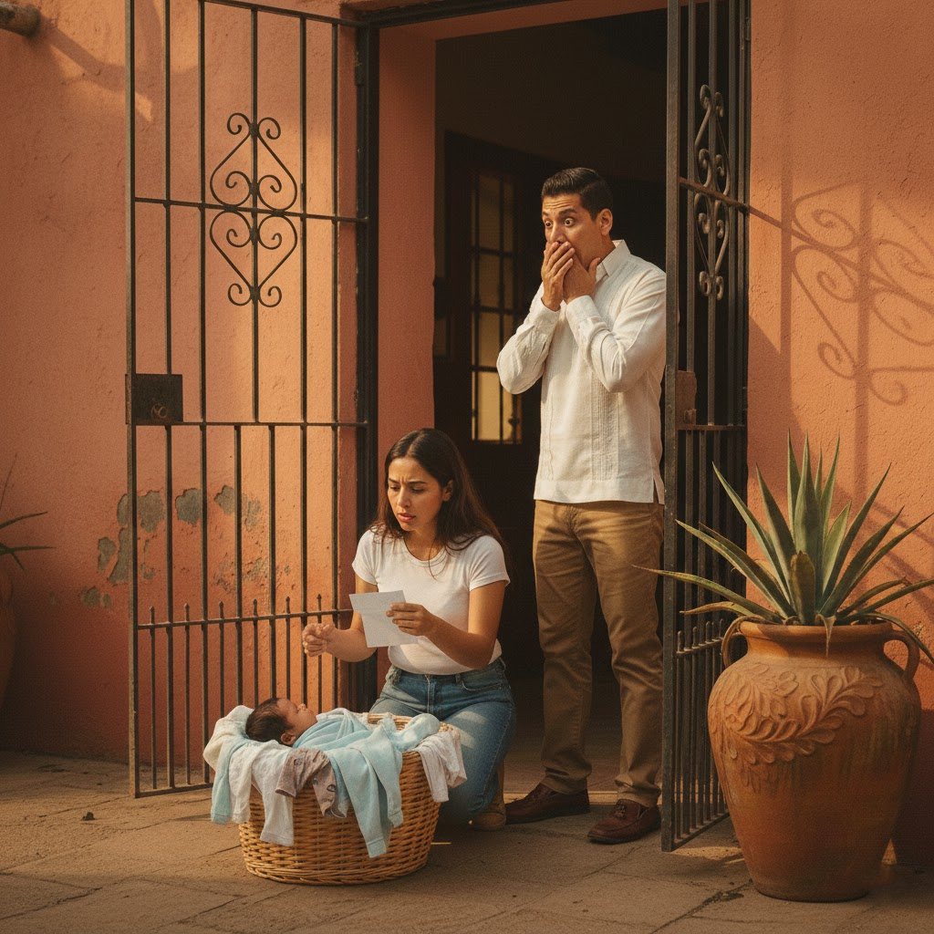 Un bebé, envuelto en una manta limpia, dormía adentro de una canasta tejida. Al lado, un papelito: