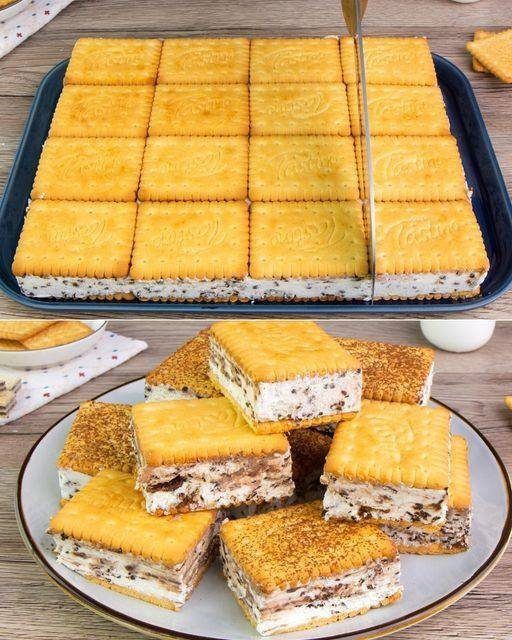 Montar los sándwiches de helado. Extienda la mezcla de helado preparada sobre las galletas, luego coloque la capa superior de galletas para cubrir la crema. Congelar durante 4 horas. Pasado el tiempo de congelación, corta la tarta helada en sándwiches usando las galletas como guía. Espolvorea los sándwiches de helado con cacao en polvo antes de servir.