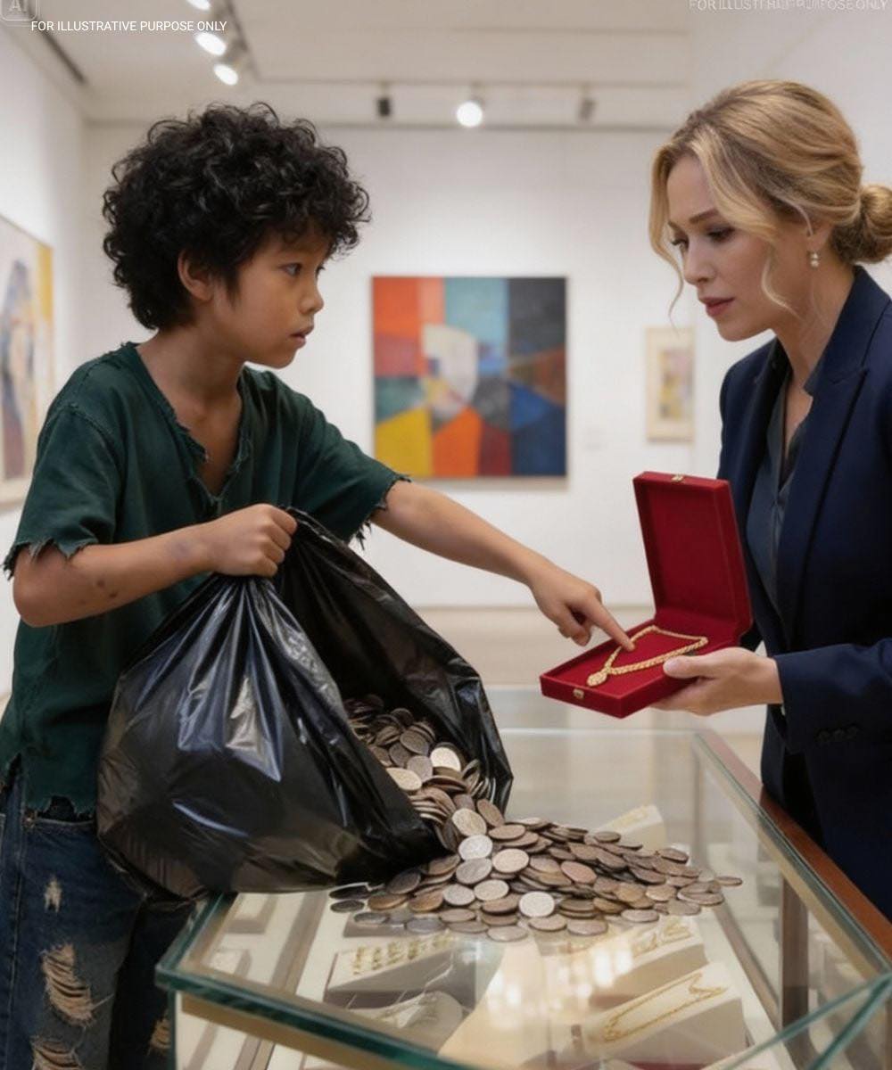 Un niño pequeño y harapiento vertía silenciosamente miles de monedas sobre el mostrador de cristal de una joyería de lujo.
