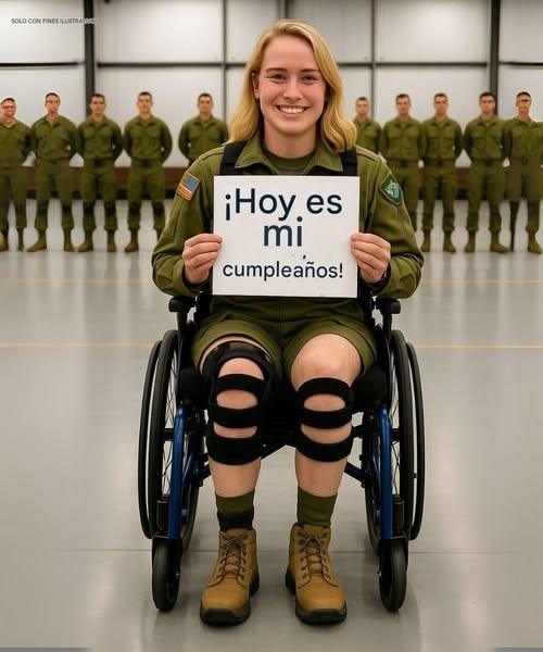 En la imagen, una joven vestida con uniforme militar aparece sentada en una silla de ruedas, sosteniendo un cartel con un mensaje sencillo pero significativo: “¡Hoy es mi cumpleaños!”. Detrás de ella, sus compañeros soldados se yerguen orgullosos en formación, mostrando su apoyo.