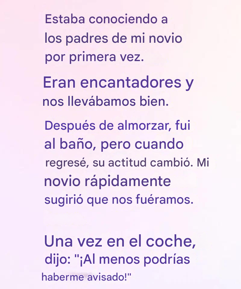 Cuando me escabullí al baño y regresé, la alegría se había desvanecido. El espacio se sentía pesado, el padre de mi novio evitaba mi mirada y la sonrisa de su madre parecía forzada. Antes de que pudiera hablar, mi novio nos sacó corriendo, despidiéndose brevemente.